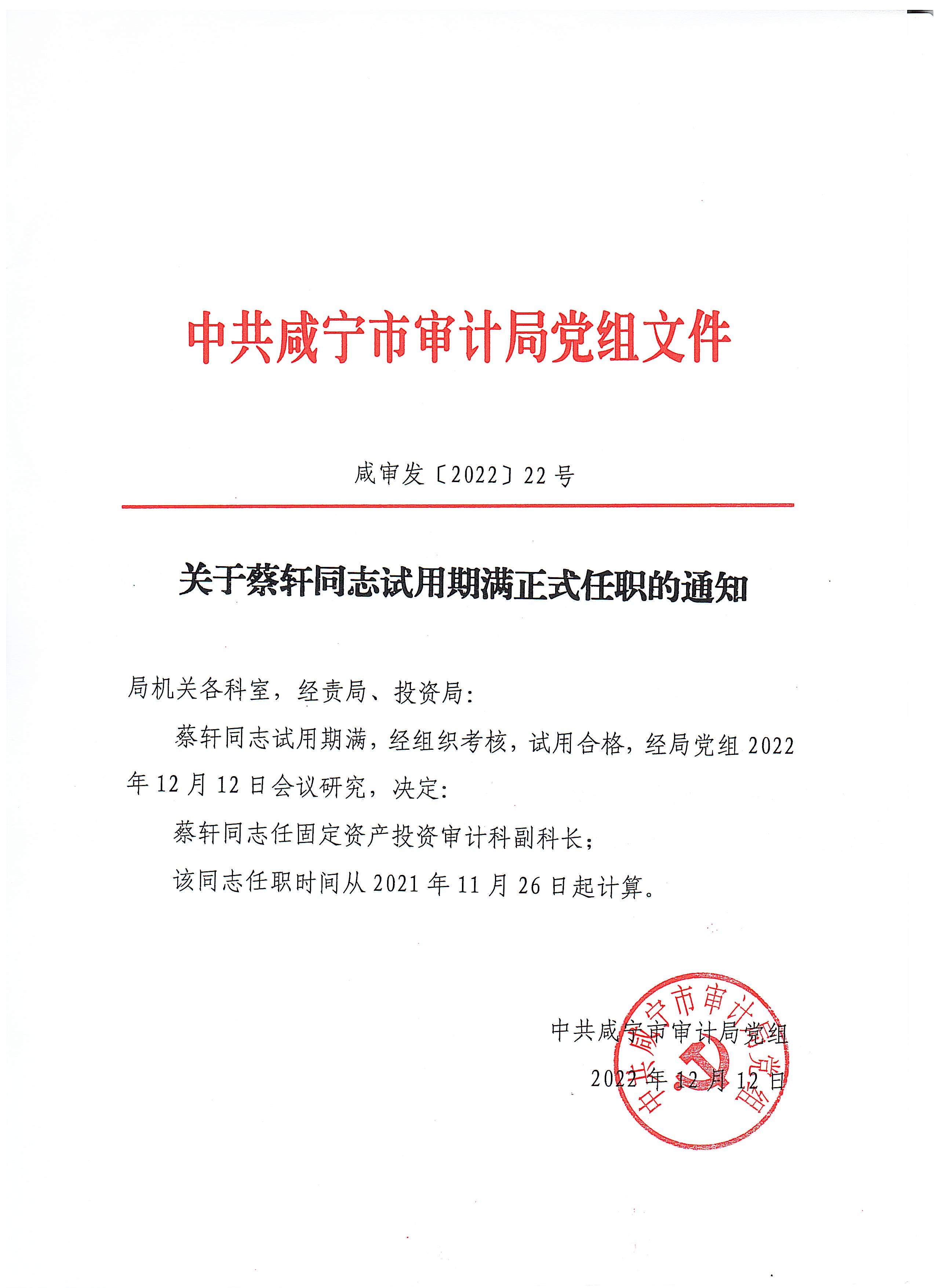 关于蔡轩同志试用期满正式任职的通知