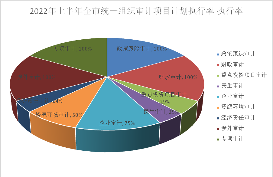 2022年,我局制定了《咸宁市2022年度统一组织审计项目计划》,拟定全年审计项目69个,其中政策跟踪审计7个,财政审计8个,重点投资项目审计7个,民生审计8个,企业审计4个,资源环境审计2个,经济责任审计25个,涉外审计1个,专项审计7个。上半年审计项目计划执行情况如下: