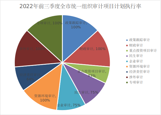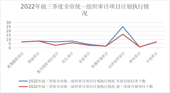 2022年,我局制定了《咸宁市2022年度统一组织审计项目计划》,拟定全年审计项目69个,其中政策跟踪审计7个,财政审计8个,重点投资项目审计7个,民生审计8个,企业审计4个,资源环境审计2个,经济责任审计25个,涉外审计1个,专项审计7个。前三季度审计项目计划执行情况如下: | ||||
