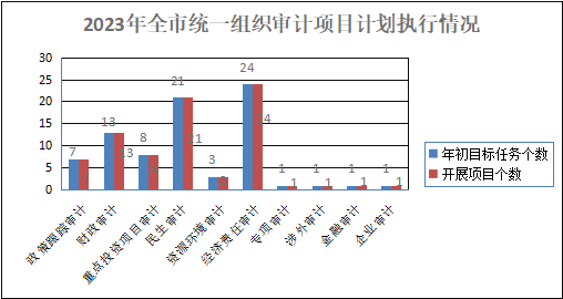 2023年,我局制定了《咸宁市2023年度统一组织审计项目计划》,安排全年审计项目80个,其中政策跟踪审计7个,财政审计13个,重点投资项目审计8个,民生审计21个,企业审计1个,金融审计1个,专项审计1个,涉外审计1个,资源环境审计3个,经济责任审计24个。全年审计项目计划执行情况如下:
