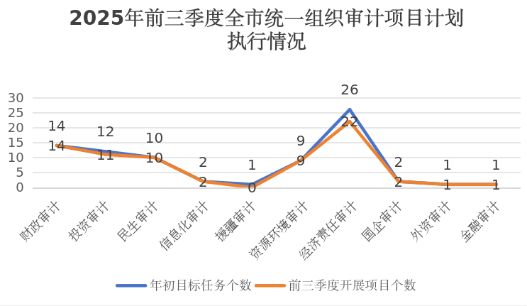 我局制定了《咸宁市2025年度统一组织审计项目计划》,拟定全年审计项目计划78个,其中财政审计14个,投资审计12个,民生审计10个,信息化审计2个,援疆审计1个,资源环境审计9个,经济责任审计26个,国企审计2个,外资审计1个,金融审计1个。前三季度审计项目计划执行情况如下: